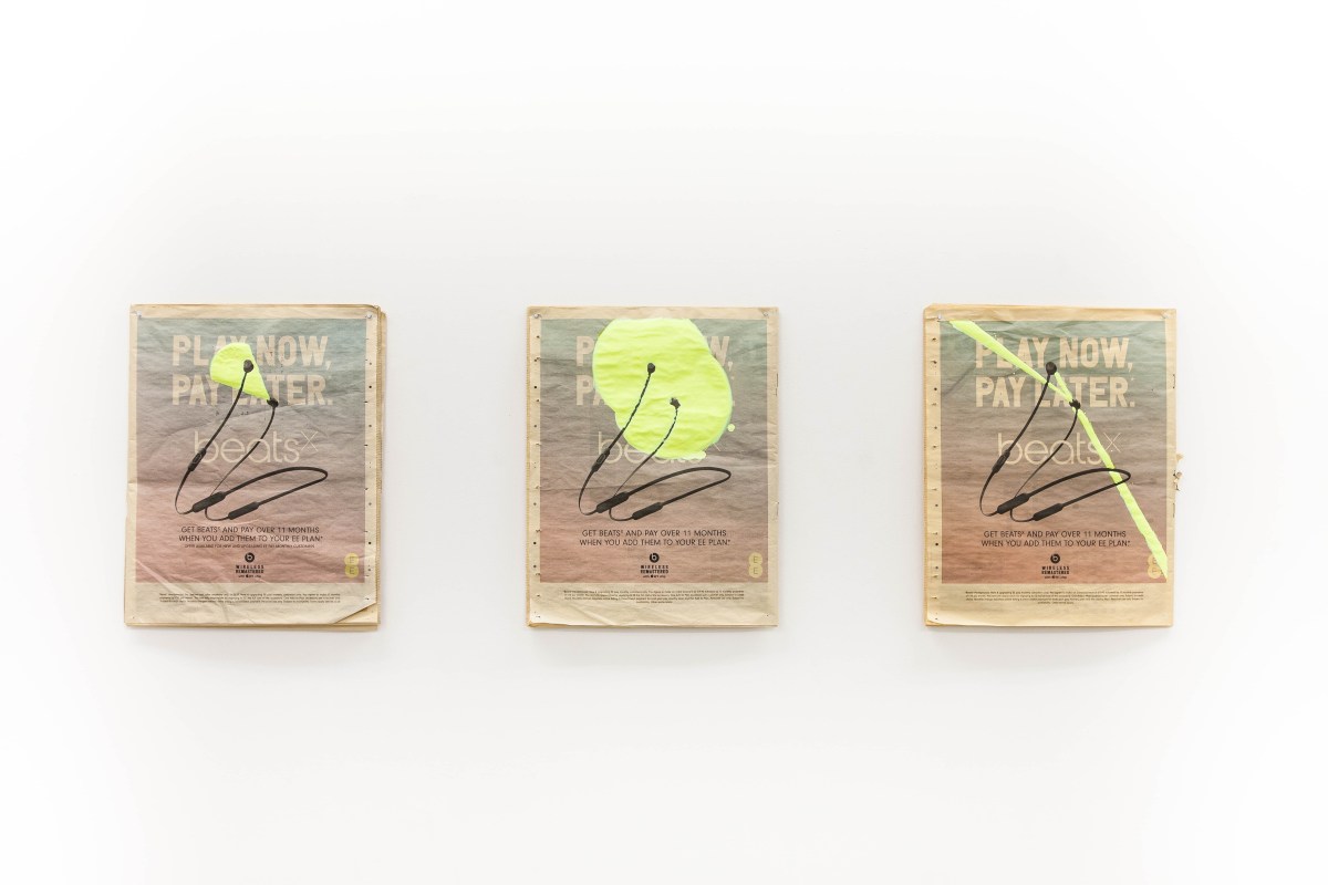 Liquid luminous chalk has emulsified on newspaper adverts. Shapes drawn as if broadcasting from the headphones. The luminosity of the chalk apes the sounds that would radiate from the earbuds. The ethereal being transformed into stone, albeit a crumbling, cracking, fragile stone.