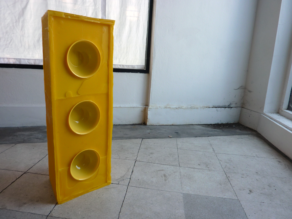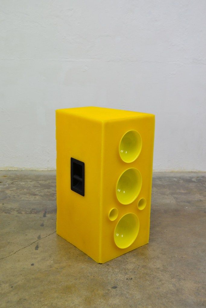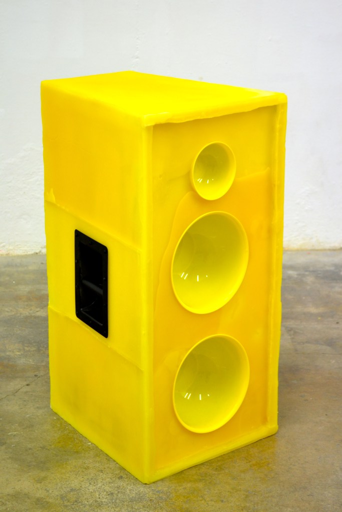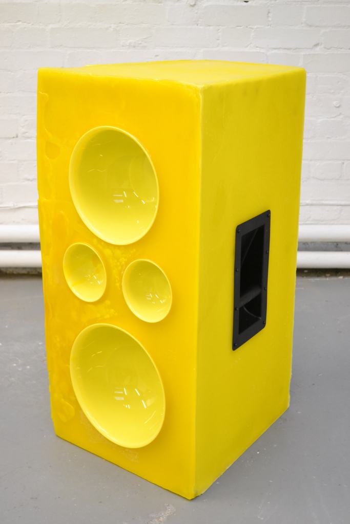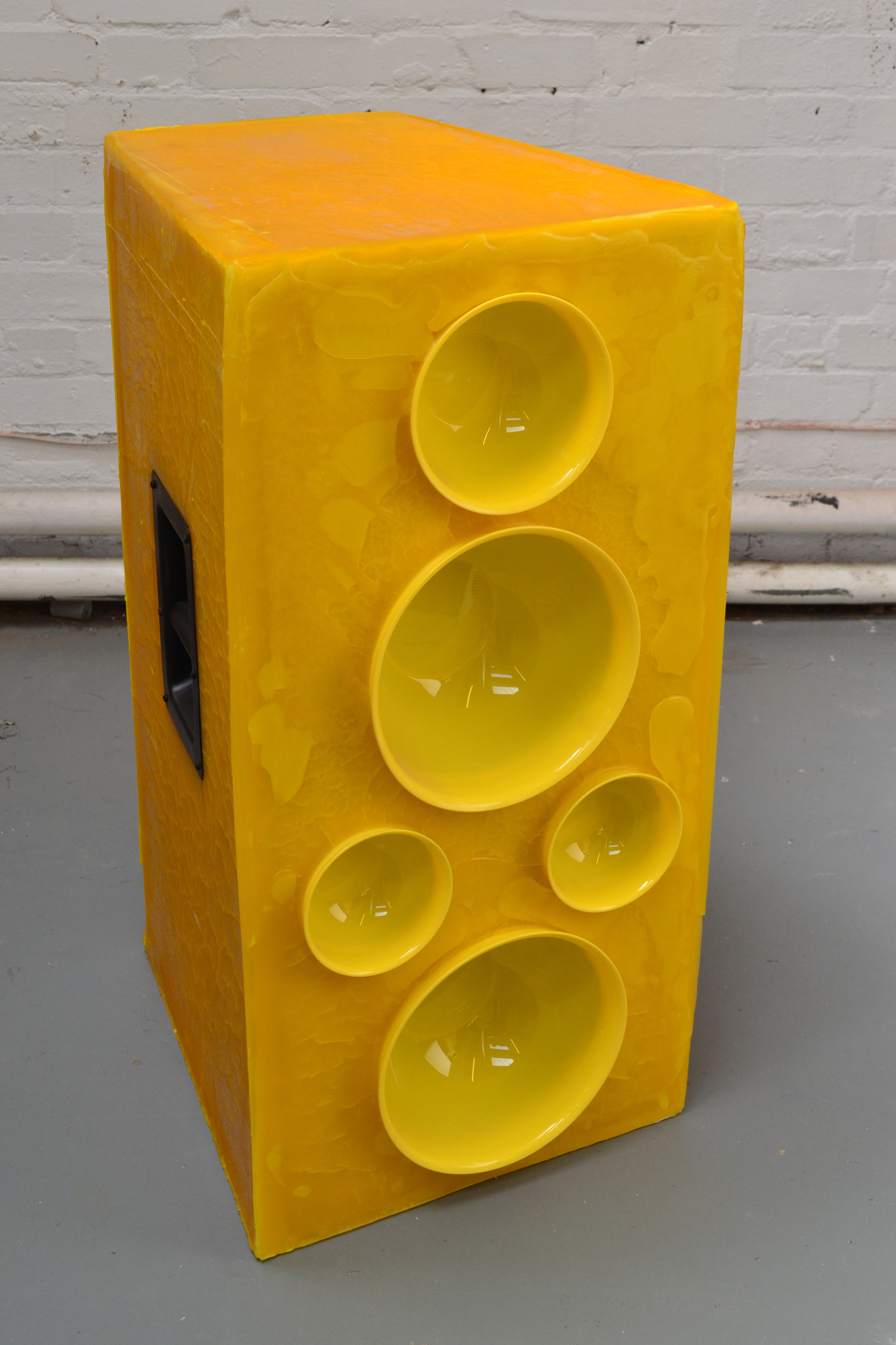 Architecture was a main focus point for the MegaBoomBox sculptures. Comparing rituals and acoustic architecture found in European churches, architecture that, whilst working with an organ or choir they are able to produce notes beyond normal hearing, resulting in a more sublimely physical effect, with the similar phenomenon obtained in the contemporary, and often hand built architecture of Dub sound systems. The speakers body having been recast in wax, drawing comparisons between the modern and older ritualistic uses and sublime acoustic techniques.
