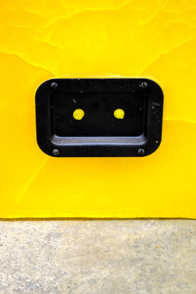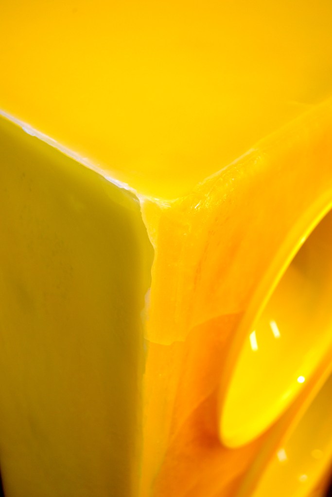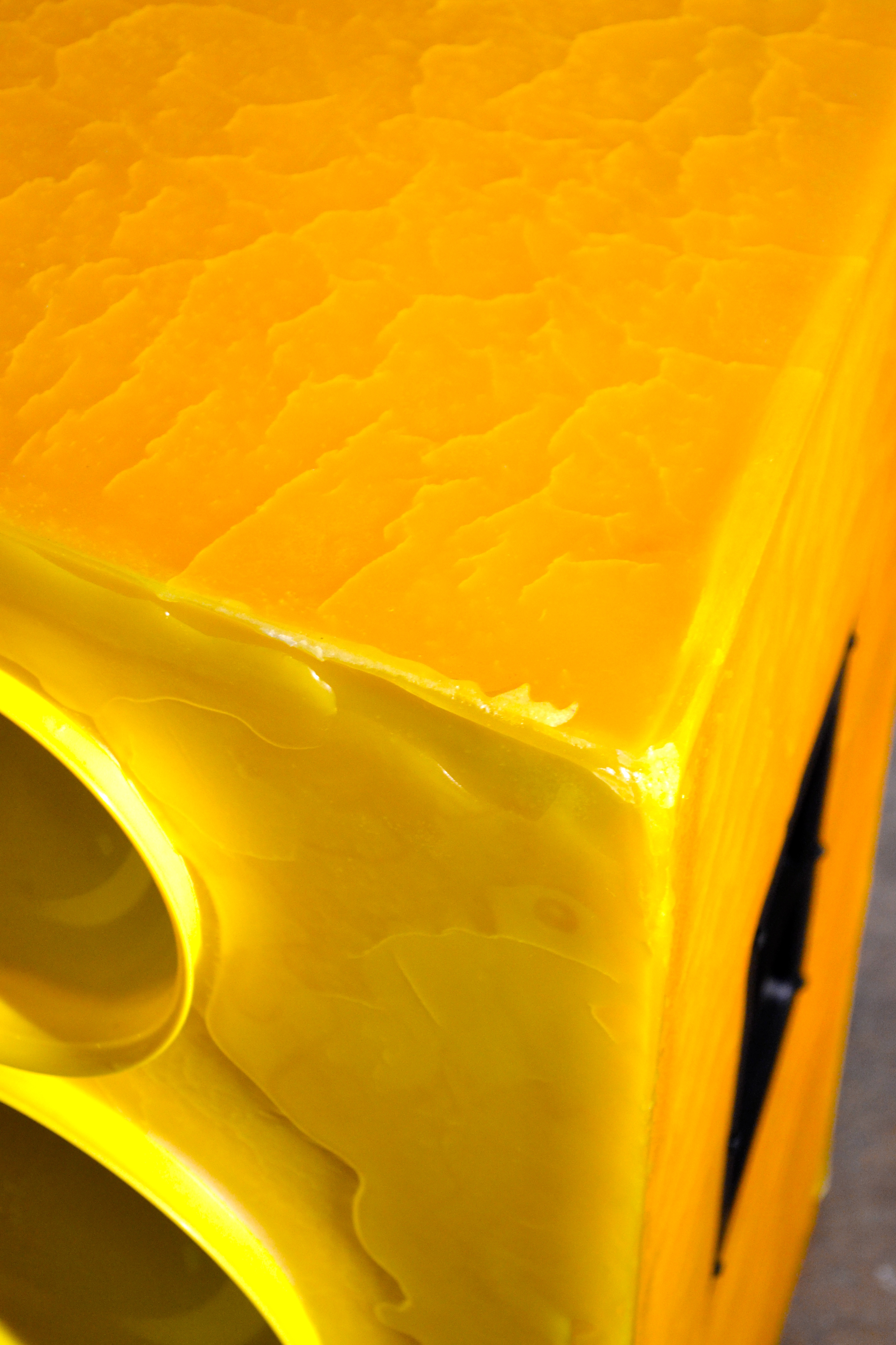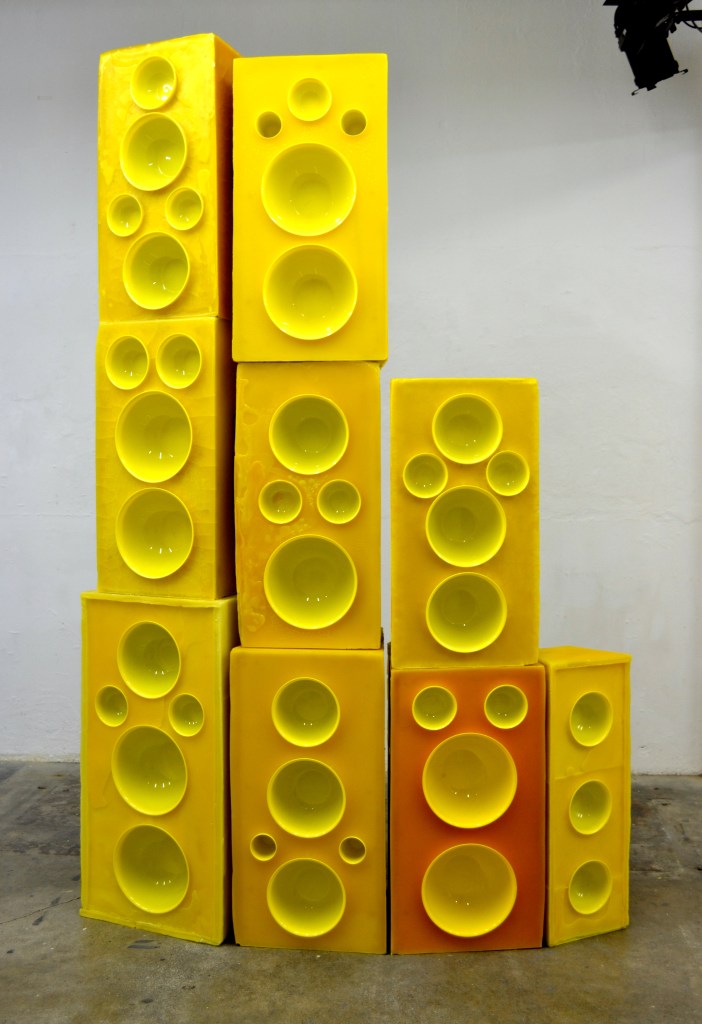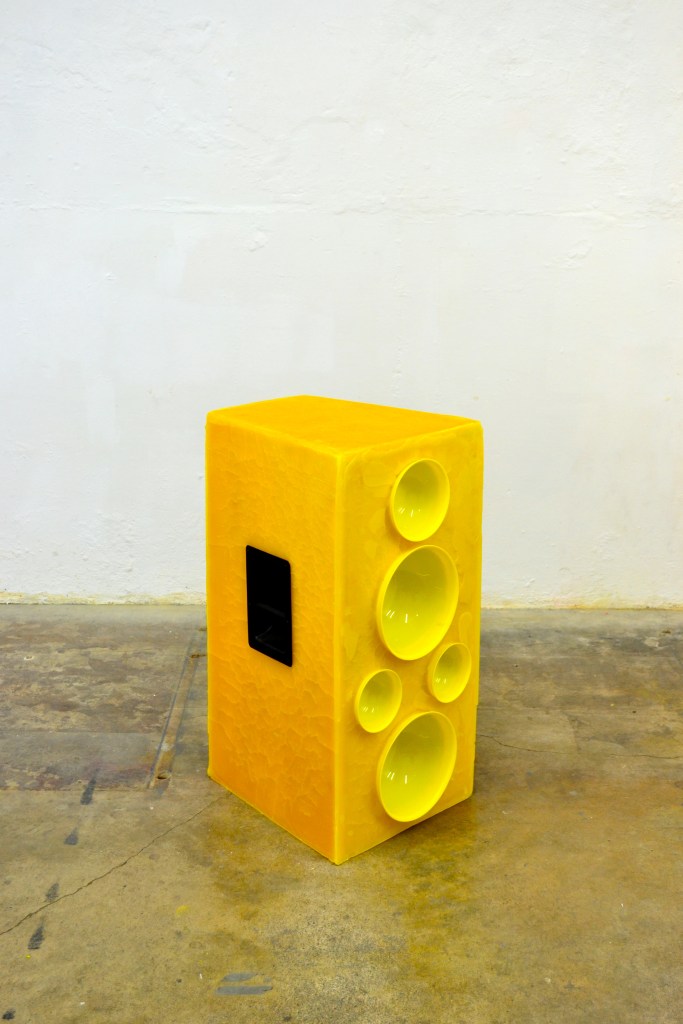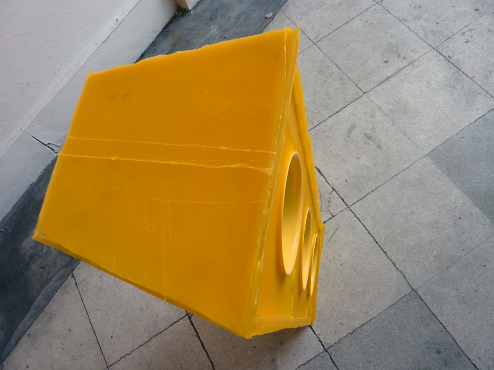 Architecture was a main focus point for the MegaBoomBox sculptures. Comparing rituals and acoustic architecture found in European churches, architecture that, whilst working with an organ or choir they are able to produce notes beyond normal hearing, resulting in a more sublimely physical effect, with the similar phenomenon obtained in the contemporary, and often hand built architecture of Dub sound systems. The speakers body having been recast in wax, drawing comparisons between the modern and older ritualistic uses and sublime acoustic techniques.